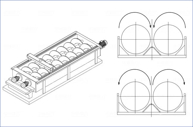 為了將砂匯集到洗砂槽中部的排出槽體,雙螺旋洗砂機兩個螺旋是呈相反方向進行旋轉,可以是相對旋轉,也可以使相向旋轉,如下圖所示。