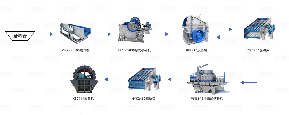 設(shè)備搭配:ZSW380x95給料機(jī)+PE600x900顎式破碎機(jī)+PF1214反擊破+4YK2460振動篩+VSI8518沖擊式制砂機(jī)+2YK1854振動篩+2914洗砂機(jī);