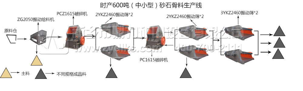 從工藝流程圖可以看到,時產600噸的中小型砂石骨料生產線不像大型、大型的生產線那種復雜曲折,這個工藝流程圖比較通俗易懂,一目了然。原料倉的物料進過振動給料機進入破碎機破碎腔內進行破碎的工作,破碎的物料經過兩臺振動篩的同時篩分,一部分物料經過篩分得到顆粒粒度合適的成品料,另一部分物料直接進入二級破碎機破碎腔內部進行再次破碎,然后再經過不同直徑規格的振動篩進行篩分,再次獲得不同顆粒粒度的成品料。