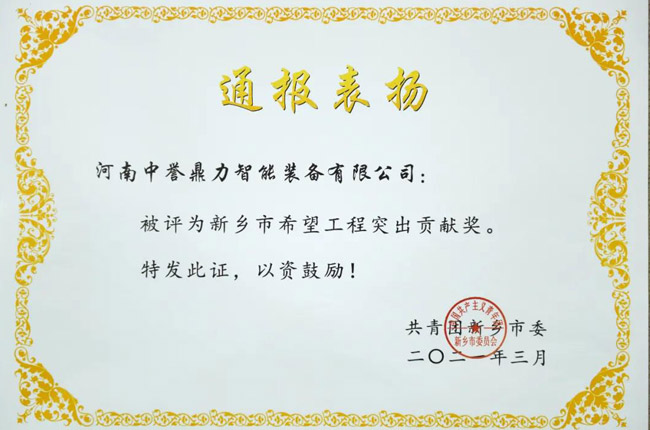 會議宣讀了《共青團新鄉市委關于表揚2020年度集體和個人的通報》,對新鄉市過去一年在疫情防控、復工復產、脫貧攻堅和鄉村振興等工作中取得成績的集體和個人進行表彰——河南中譽鼎力智能裝備有限公司團總支被授予“新鄉市五四紅旗團(總)支部”;河南中譽鼎力智能裝備有限公司被授予“新鄉市希望工程突出貢獻獎”!