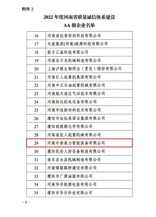 12月13日,河南省質量協會發布《關于公布2022年度河南省質量誠信體系建設A等企業名單的通知》,河南中譽鼎力智能裝備有限公司憑借的產品和服務質量順利獲評2022年度河南省質量誠信體系建設AA級企業名單。
