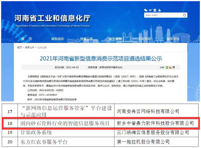 近日,河南省工信廳信息化和軟件服務業(yè)處對2021年河南省信息消費項目遴選結(jié)果進行公示。新鄉(xiāng)市中譽鼎力軟件科技股份有限公司“面向砂石骨料行業(yè)的智能信息服務項目”成功入選名單,并順利通過公示。