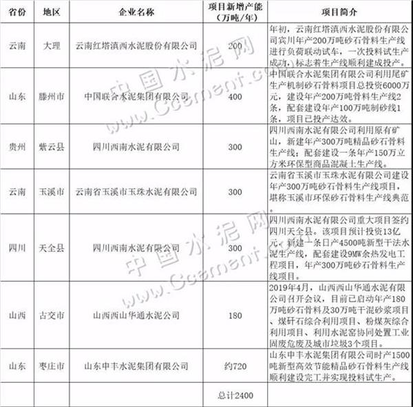 以下表格列舉了部分水泥企業2019年投產的砂石骨料生產線,年產骨料約2400萬噸。