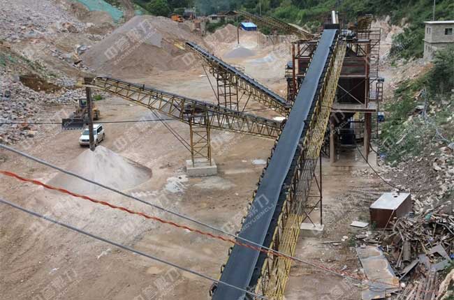石料從山上爆破下來,經過卸料車將石料送進一臺ZGC1538振動給料機,振動給料機會把廢料篩分來,成品料質量。剩下的物料被送至PCZ1615型重型反擊錘式破碎機進行段破碎,經過一道2YKZ2460振動篩并篩,篩分出泥石粉和1-3碎石。剩下的料由輸送帶送至中轉料倉,從中轉料倉被送至一臺ZSJ1218雙轉子制砂機進行段破碎,再經過一道2YKZ2460振動篩并篩,篩分1-2碎石、瓜米碎石和0-5砂三種成品料,被輸送帶送到成品料區。