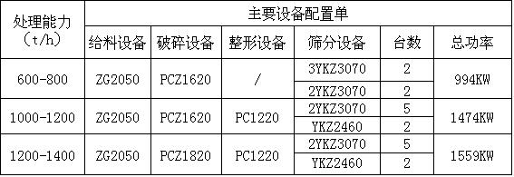 石子生產線由于產量規模不同,配置的設備也不同,新鄉鼎力為新老客戶配置生產線,從時產50噸-1600噸之間的生產線都可以進行配置,簡單的介紹下時產1200-1400噸、時產1000-1200噸、時產600-800噸大型石子生產線配置的設備,如下圖: