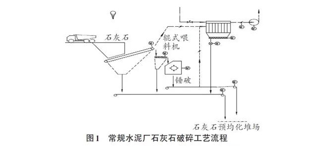 該水泥廠原有石灰石碎石生產線為重型板式喂料機+波動輥式喂料機+重錘式破碎機體系,聯合粉碎能力通常在900~1100噸/時,工藝流程見圖1: