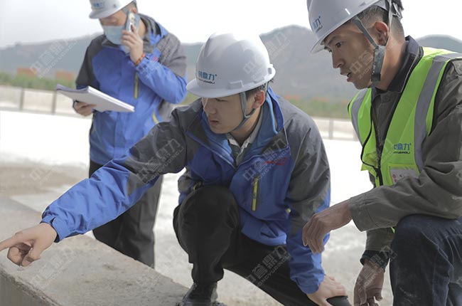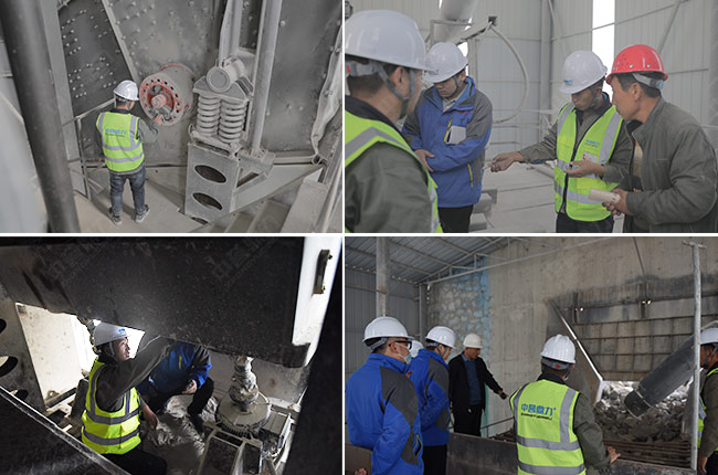在現場,售后服務團隊各司其責,分別對這條時產1500噸砂石生產線的給料機、破碎機、制砂機、振動篩、減速機、輸送設備、散裝機、除塵設備、拉鏈機、電氣設備等進行細致檢查,并做詳細記錄。同時也向項目相關負責人就設備的日常使用保養、注意事項提出了建議。