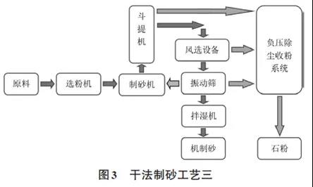 圖3表示砂石分選設備布置在制砂機下料位置,先選粉再粉碎制砂。