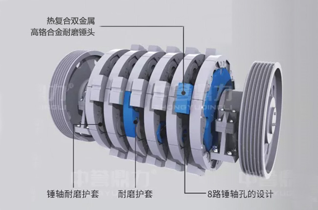 出料口采用無篦條設(shè)計,滿足出料粒度要求的直接排出,減少了物料在機腔內(nèi)的停留時間,對錘頭等配件的磨損較小;采用熱復(fù)合雙金屬,高鉻合金耐磨錘頭,使用壽命比普通錘頭提高至少15%;轉(zhuǎn)子外圍加裝耐磨護圈,避免物料與轉(zhuǎn)子本身的直接碰撞,增加轉(zhuǎn)子使用時間;